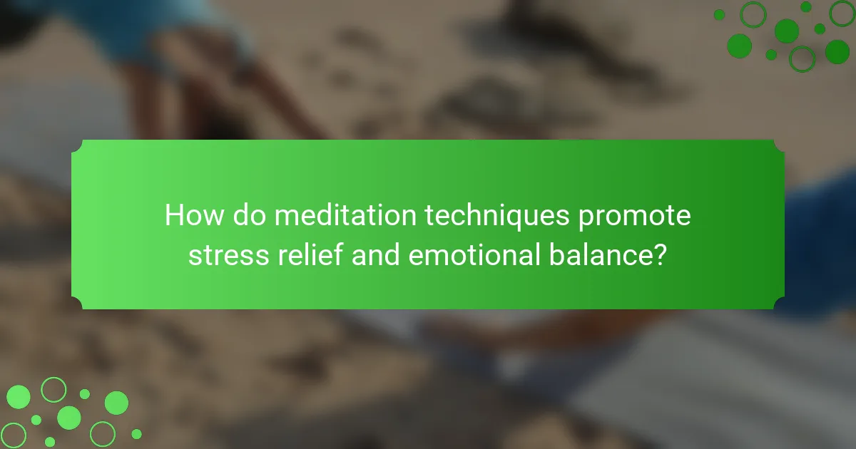 Meditation techniques effectively promote stress relief and emotional balance by fostering mindfulness and reducing anxiety. Techniques such as mindfulness meditation, loving-kindness meditation, and body scan meditation help individuals connect with their emotions and cultivate a sense of calm.